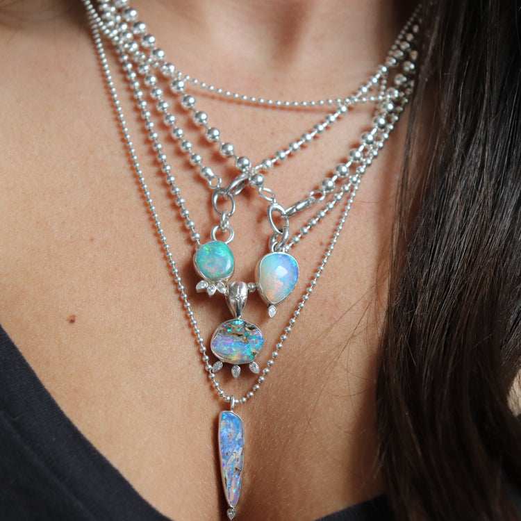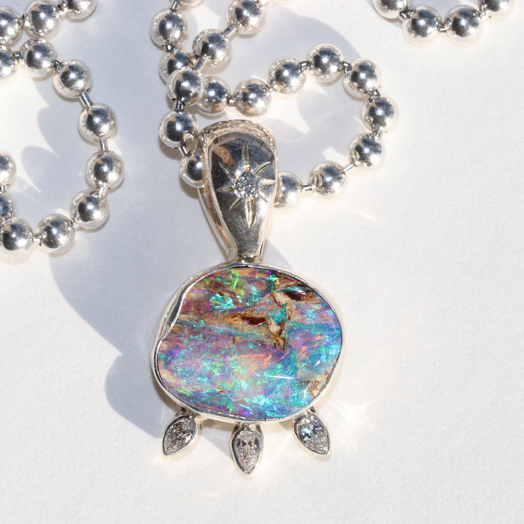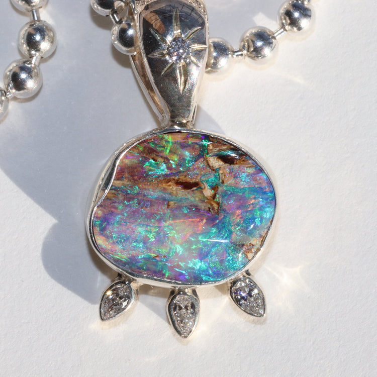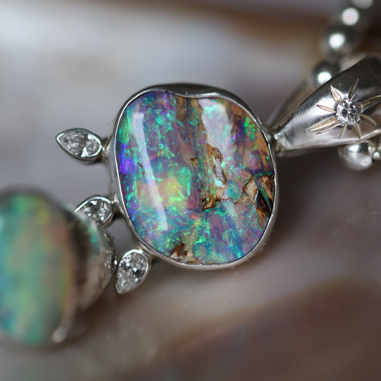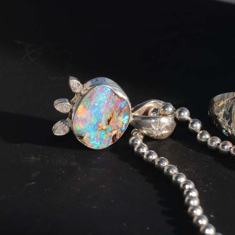 Eclipse is one of our most captivating creations — every detail feels intentional, from the glowing opal to the sparkling pear diamonds. Look closely into the opal and you’ll see a universe of color, a story millions of years in the making, captured in a single piece