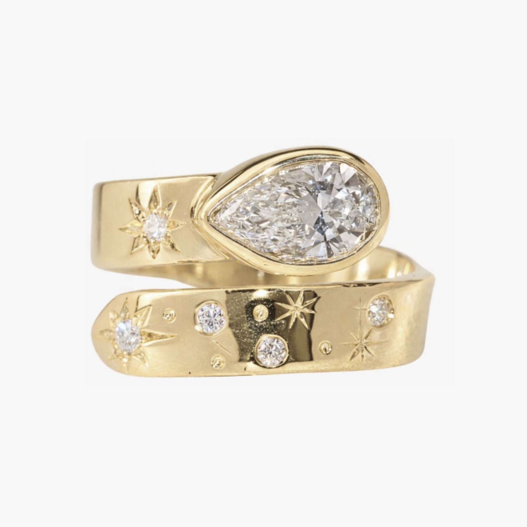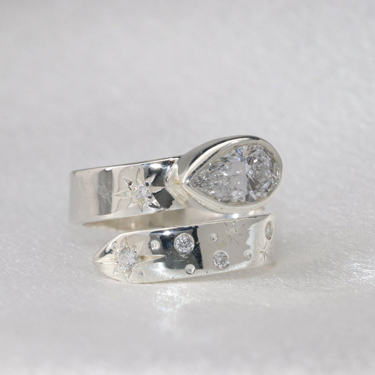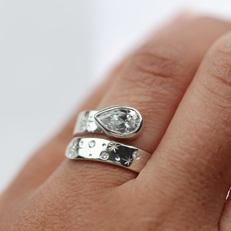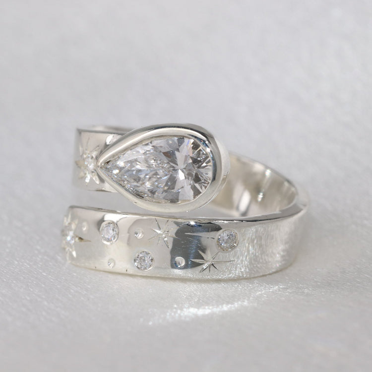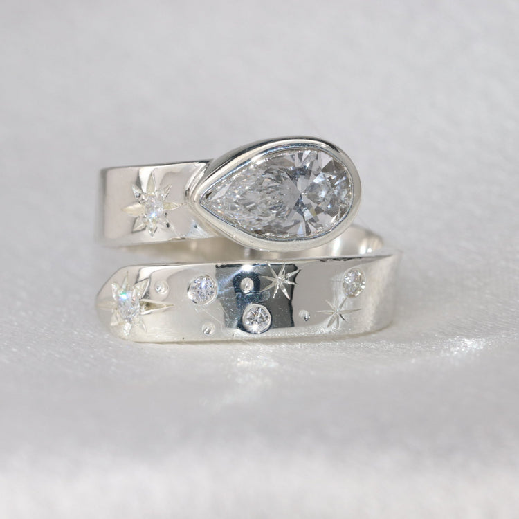 Cleo is a stunning irreplaceable design with a Pear Lab Diamond, with the band resembling our stunning night sky. If diamonds are a girl's best friend, then Cleo is your new BFF. It's a dazzling piece of jewelry designed to capture the beauty of the night sky.