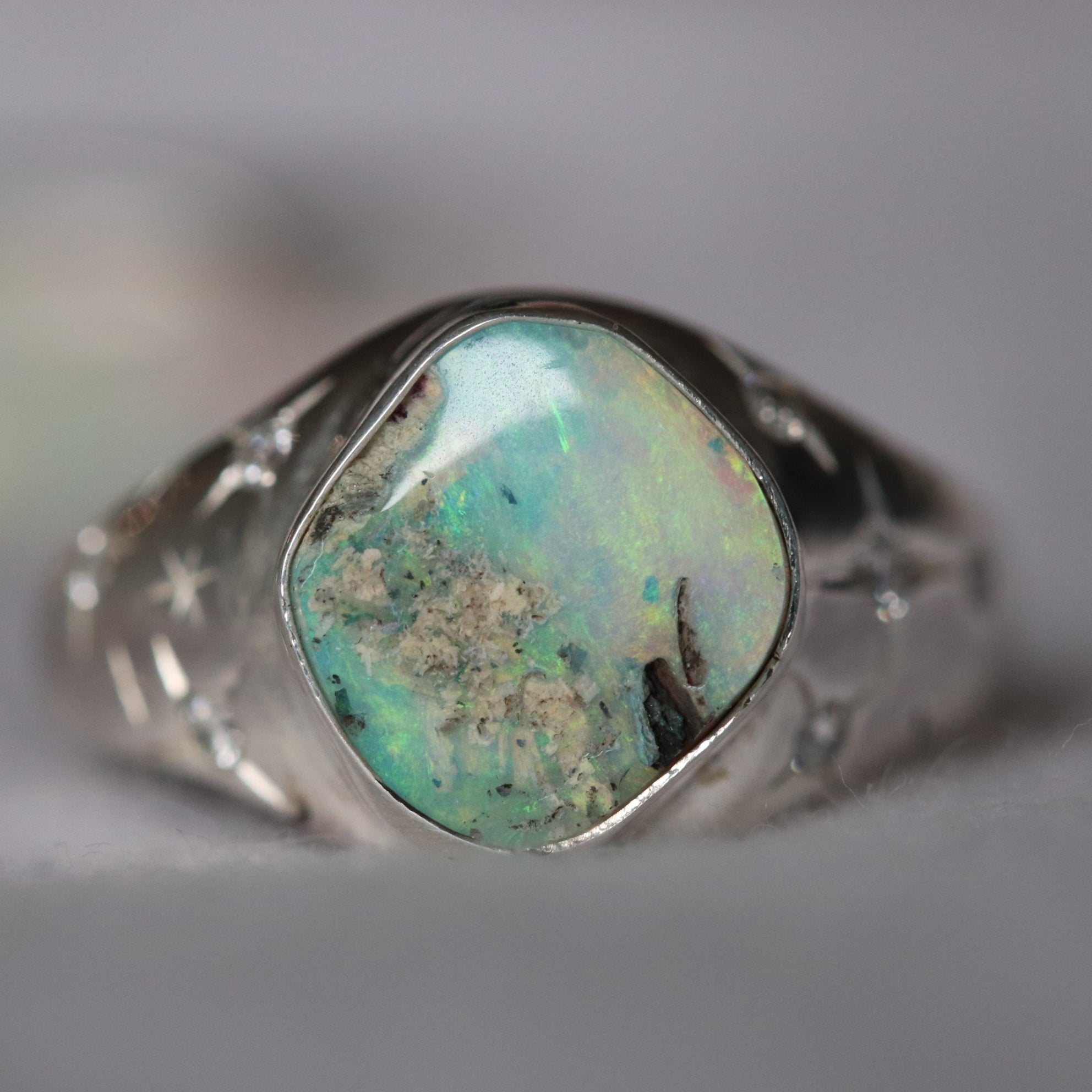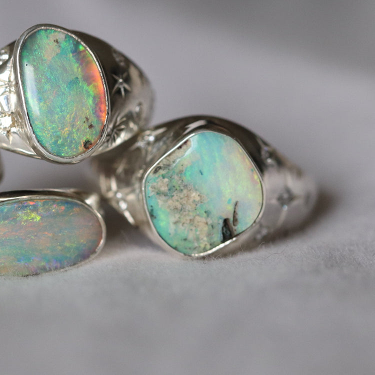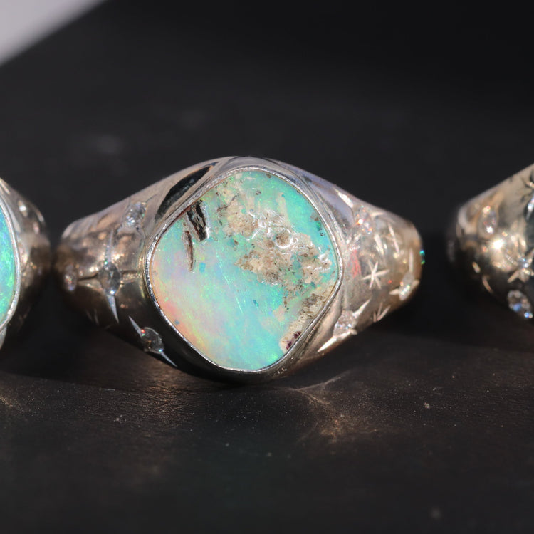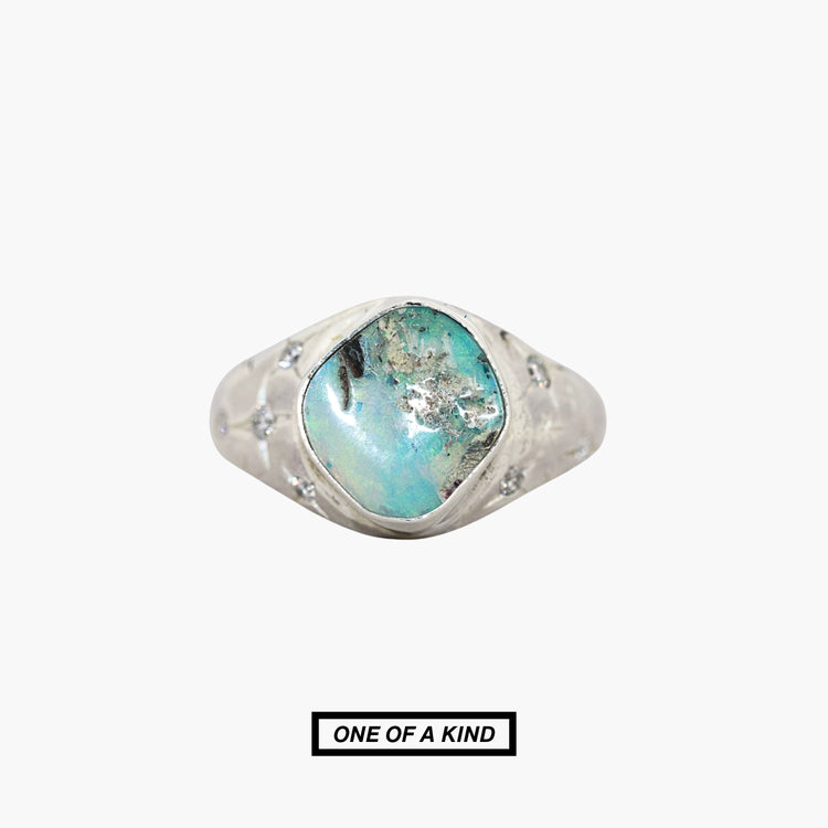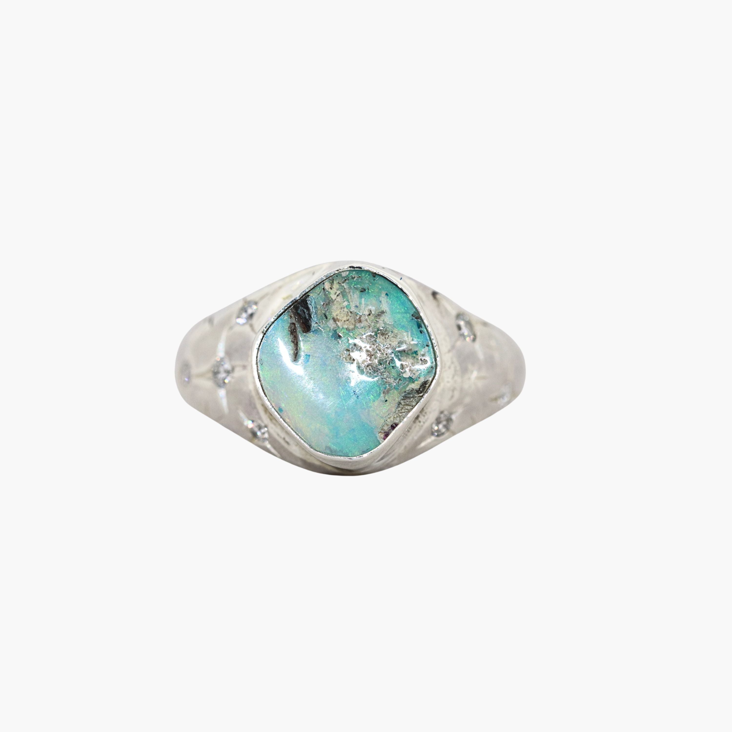 Lunara is an elegant signet ring featuring a gentle light turquoise opal with a delicate appearance. It is enhanced by six lab-grown diamonds, each measuring between 1.5mm and 2mm, adding refined sparkle.